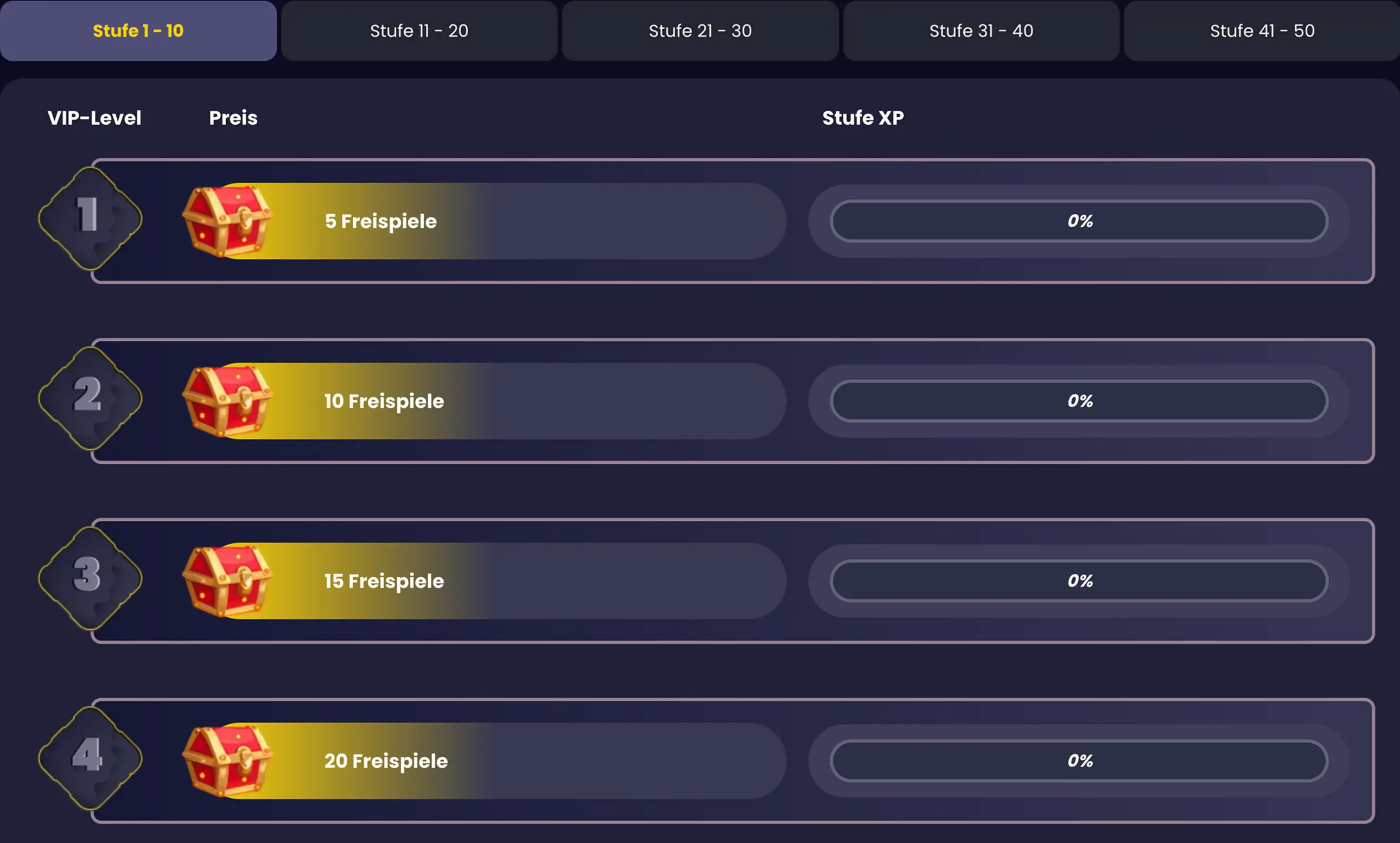 - Das 50-Level-VIP-System honoriert regelmäßige Aktivität, nicht bloß hohe Einzahlungssummen